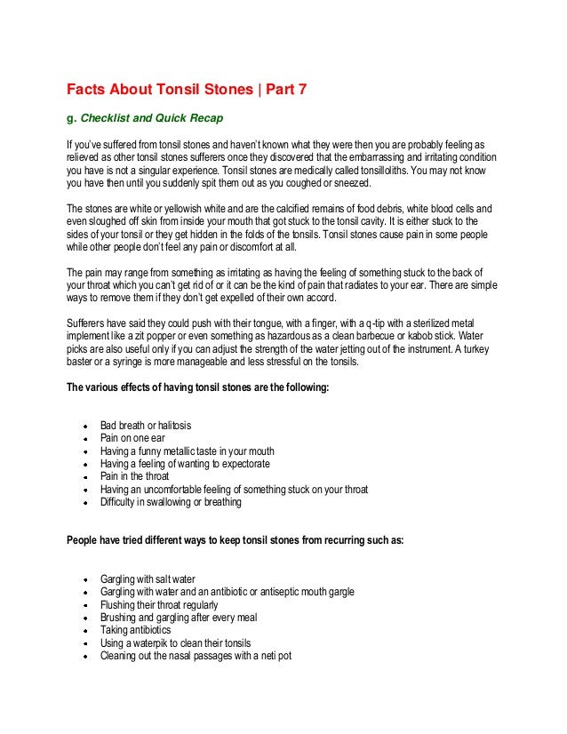 The best way to remove deep, hidden tonsil stones is to flush the tonsils out with water. The gentle stream of water from the water flosser allows deep tonsil stones to flow out of the tonsil quickly and easily providing immediate relief. I can just barely see them when i look in the mirror. When it feels like something is stuck in the throat, drinking extra sips of water. If the stone is large enough, it could get in the way of normal swallowing of food and drink. A rock in my throat the story of a terrible tonsil stone. Tonsil stones may make it feel like your throat is scratchy or make you cough. Do this very carefully as it may cause additional infection if done aggressively. The only problem is that i've squeezed the stones out of my tonsils tonight and i think i've gotten them all. Either gargle with salt water or use a water flosser to rinse bacteria off of your tonsils every week. There are many simple things that you can do at home to get rid of tonsil stones. Tonsil stones aren't dangerous or harmful, but they can be annoying especially until they loosen and make their way out of your throat. When a tonsil stone reaches a certain size, you will feel like a piece of hair or husk from a bit of food has stuck there and is scraping your throat.